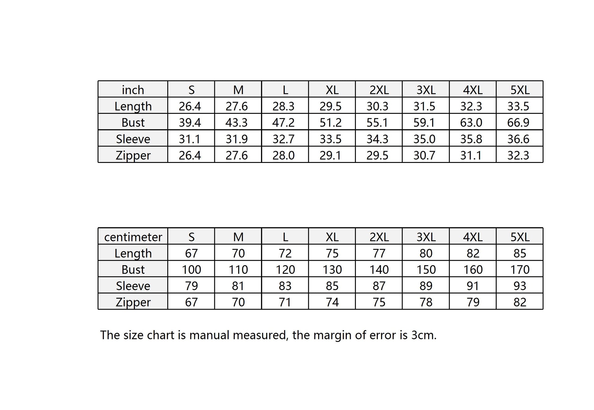 | Centimeter | S | M | L | XL | 2XL | 3XL | 4XL | 5XL |